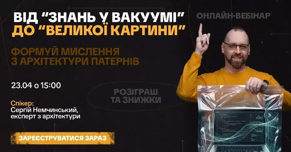 Сьогодні закінчився майстер клас по паттернам. З творчістю Сергія я познайомився, як і більшість людей, на ютубі. Я дивився і думав, розумний дядько, а потім гортав DOU і побачив, що буде майстер клас, я записався, хоч у мене і були деякі знання, але вони були фр…