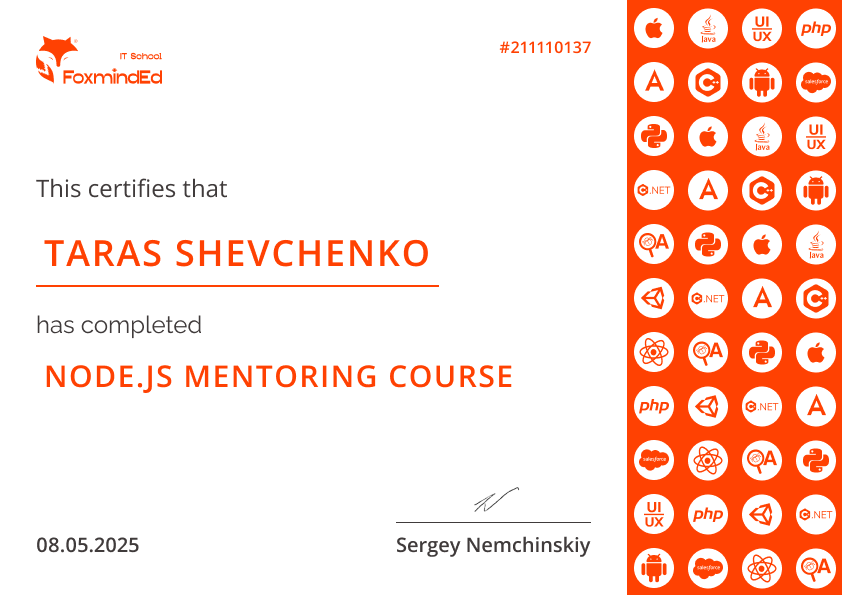 Після проходження курсу ви можете показати роботодавцю репозиторій із завданнями (CLI/Express/боти), вміння працювати зі стеком (MongoDB, AWS-сервіси, контейнеризація), доробки після рев’ю та підхід до завдань «production-style». Також у вас буде електронний сертифікат завершення курсу.
